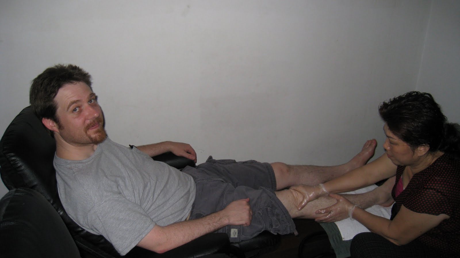 the foot, but would massage directly here," said the young man indicating his belly. But we were there for a foot massage and not a full body massage. My masseuse, realizing my problems, went about the routine of the massage, finding pressure points on my feet, but then proceeded to massage up my leg to my knees as a freebie.